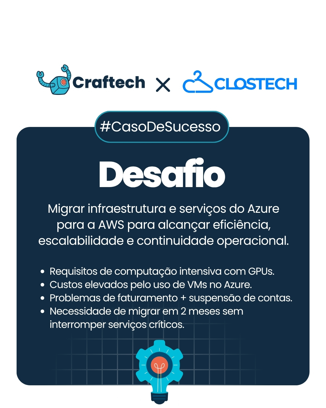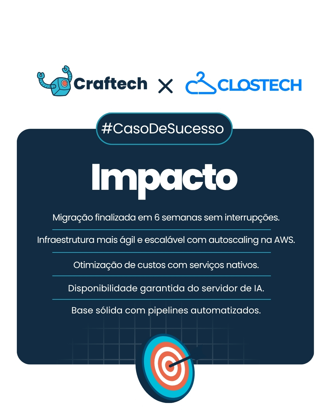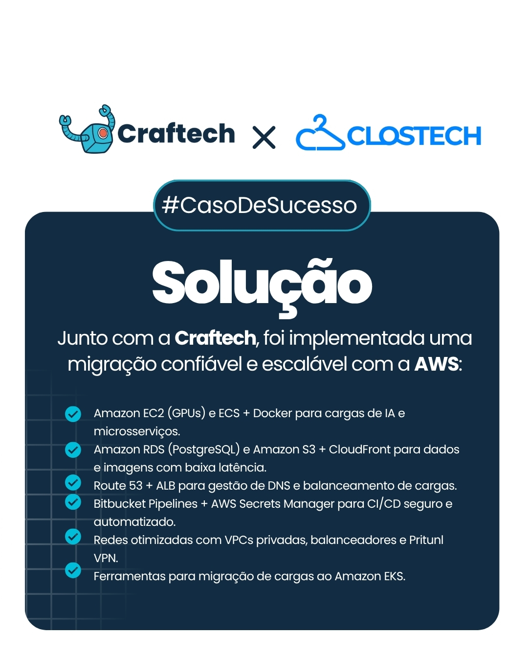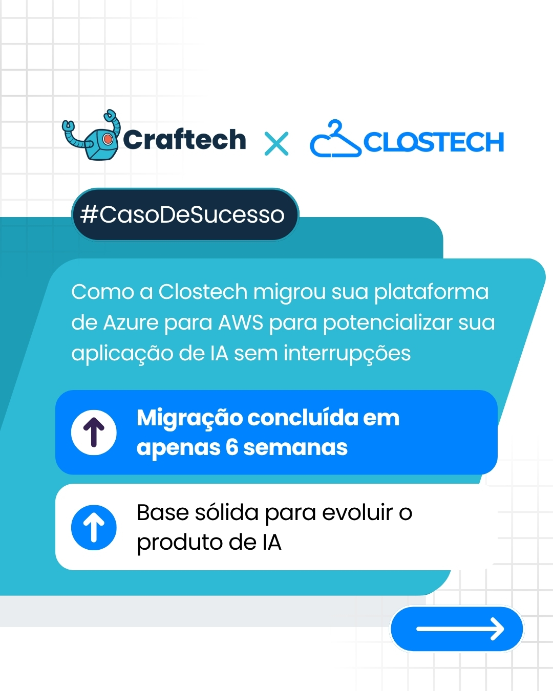 A Clostech migrou sua plataforma do Azure para a AWS com a Craftech, alcançando uma infraestrutura escalável, moderna e segura para sustentar seu provador virtual com IA na Nuvemshop. O projeto incluiu migração de bancos de dados, backend e sites estáticos, pipelines CI/CD automatizados e otimização de custos